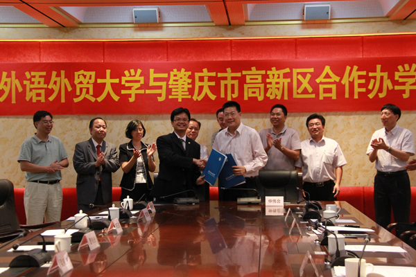 本网讯 5月27日下午,广外与肇庆市高新区合作办学签约仪式在北校区第一会议室举行。肇庆市政府副秘书长曹伟光,国家高新区管委会副主任陈玉成,市教育局副局长黄红敏,国家高新区教育局局长林海,广东明德教育投资有限公司董事长梁树洪、总裁谢锦贤,我校校长仲伟合、副校长顾也力,教育集团总经理谢应东,教育集团副总经理、广外外校校长李建民、副总经理赵观音出席了此次仪式。签约仪式由顾也力主持。
