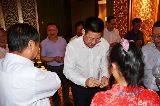 校友们高兴地接过校长赠送的母校校徽