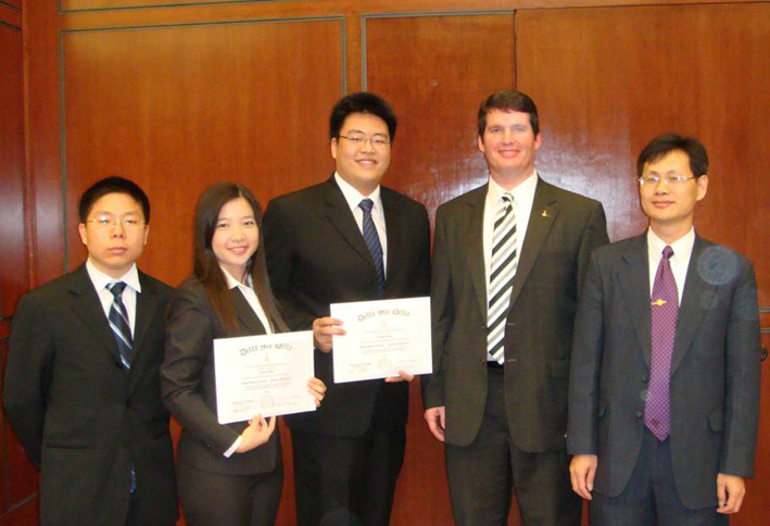 本网讯 美国当地时间3月29日晚,因学业表现优异,我校国际工商管理学院与美国哈町大学商学院联合研究生项目培养的两位MBA学生凌雄辉、佘燕贤从哈町大学商学院院长Bryan D. Burks博士手中接受了由美国国家工商管理荣誉协会(The National Honor Society in Business Administration)颁发的Delta Mu Delta荣誉奖励。