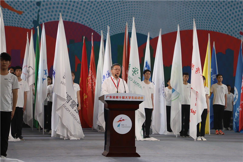 广东省第十届大学生运动会组委会主任,省委教育工委书记,省教育厅党组书记、厅长景李虎致开幕辞。他表示,本次大运会认真贯彻习近平总书记在全国教育大会上强调的树立“健康第一”的教育理念,是对我省高校体育工作的一次综合性检验。“迸发激情,追逐梦想是青年的本色!”他呼吁各位大学生积极投身于运动中去,并希望各代表队把本次大运会作为重要的展示平台,充分展示高校体育的改革成果。