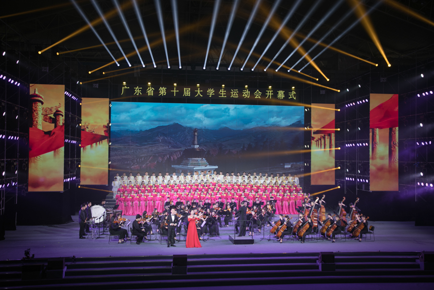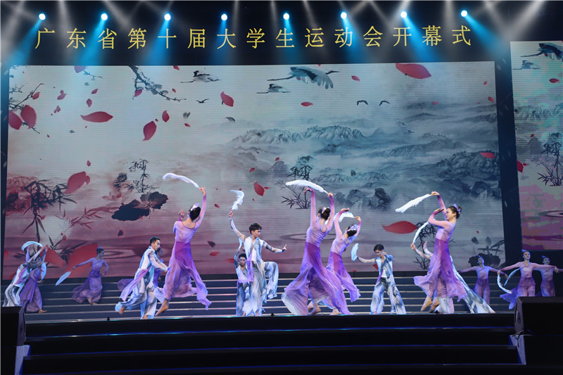 在开幕式后举办的文艺演出上,一曲会歌《梦想在呼唤》点燃了全场热情,随后歌舞《我的梦》、歌曲《朋友》,体育艺术《动感青春》、武术《功夫》均将大学生的体育活力与青春风采展现得淋漓尽致。舞蹈《水墨岭南》更是让全场观众静下心来,细细品尝岭南文化的独特风采。临近开幕式尾声,小提琴独奏《我和我的祖国》与歌舞《和祖国在一起》则跟开幕式前所有观众共同歌唱的国歌遥相呼应,在袅袅的音乐声中道尽了大学生对祖国的深情。