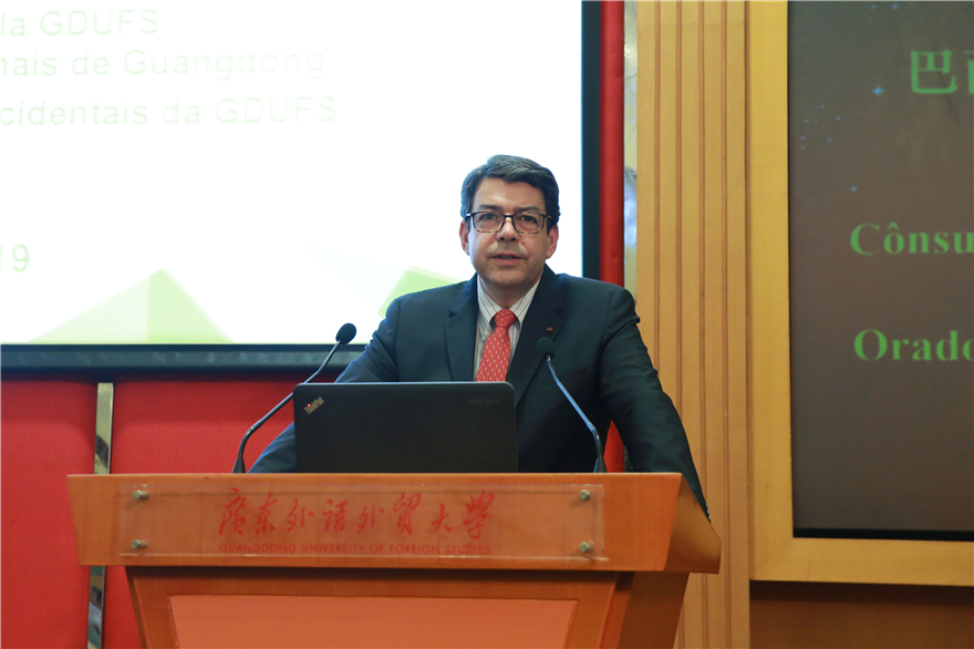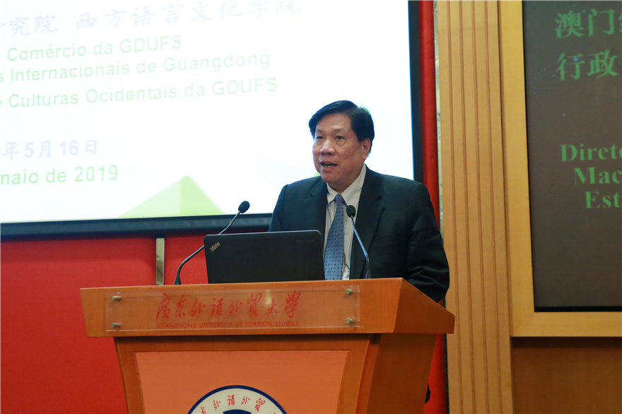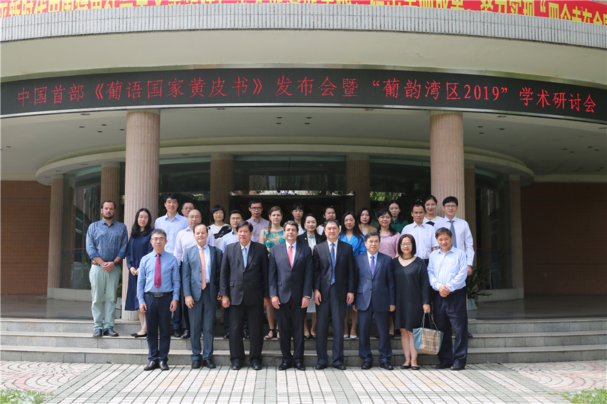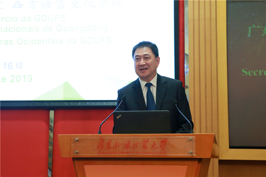 本网讯 5月16日,由我校和社会科学文献出版社联合策划出版的国内首部葡语国家黄皮书《中国与葡语国家合作发展报告(2019)》正式发布,随后,“葡韵湾区2019”学术研讨会举行。我校党委书记隋广军致欢迎辞,巴西驻广州总领馆总领事佩德罗•特拉(Pedro Murilo Ortega Terra),澳门经济学会会长、澳门特别行政区政府政策研究室前主任刘本立分别致辞。发布会由我校副校长焦方太主持。