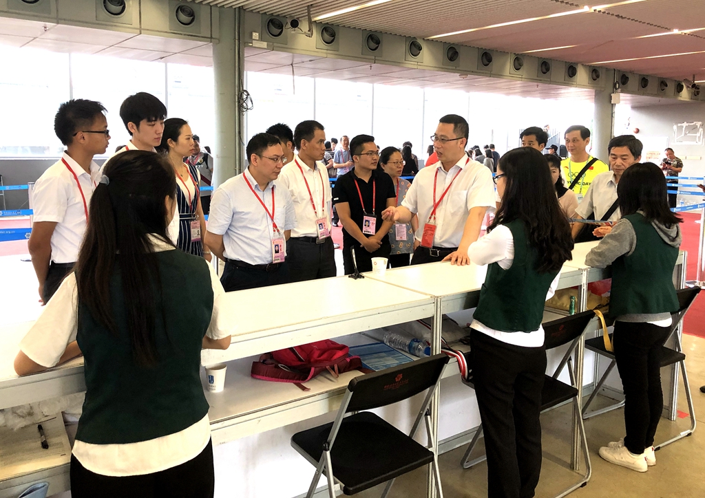 会谈后,刘海春带队前往广交会B馆境外贵宾俱乐部VIP接待室,看望在此上岗的学生,听取学生实习工作开展情况汇报;在B区办证中心,刘海春一行详细了解了客商办证的流程,并观摩了在岗同学的实际操作。刘海春一行还走访了广东盈浩工艺制品有限公司和广州福莱贸易公司两家校友参展商,与公司负责人交流了企业发展情况。