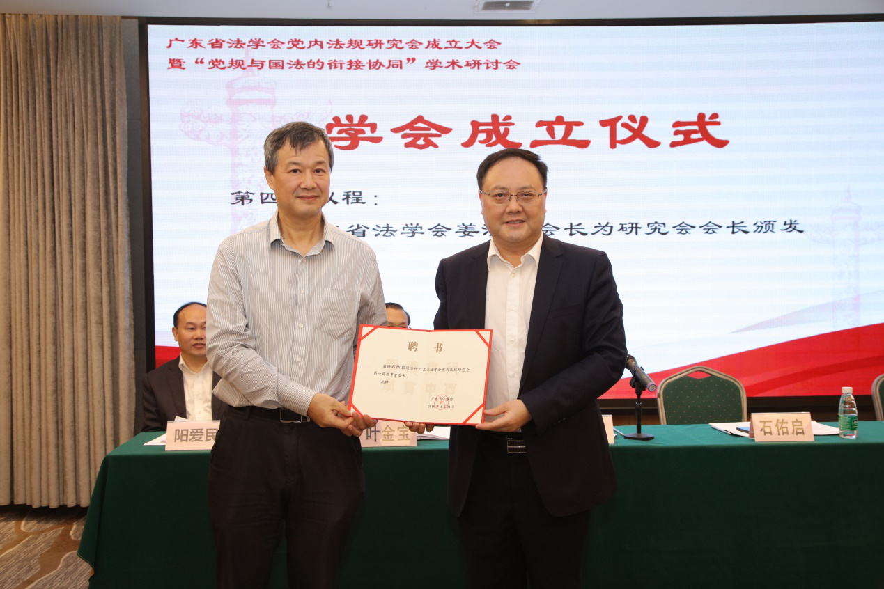 本网讯 4月21日,广东省法学会党内法规研究会成立大会暨“党规与国法的衔接协同”学术研讨会在我校举行。本次会议由广东省法学会主办,由我校党内法规研究中心、区域一体化法治研究中心、法学院承办。广东省法学会专职副会长兼秘书长姜滨,我校校长石佑启,广东省社会科学界联合会党组成员、专职副主席、秘书长叶金宝,我校副校长阳爱民,广东省教育厅科研处(研究生教育处)处长欧阳谦,广东省法学会研究部主任郑桂琼等领导出席了开幕式。