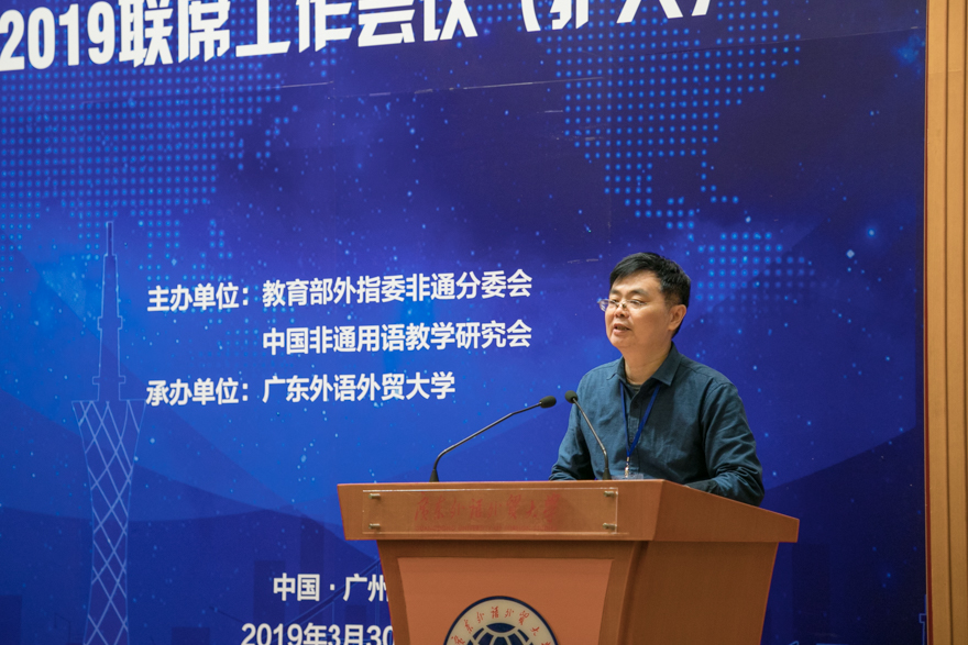 外指委非通分委会主任委员、北京大学教授姜景奎在致辞中向大会说明了选定我校来承办此次会议的意义以及此次会议本身的意义,尤其对我校的非通用语学科发展和非通用语教育表示了充分肯定与赞赏。他强调我校是国内为数不多的设立了专门的非通用语种教学与研究中心。设有国家高等学校外语非通用语种本科人才培养基地,负责对接外指委非通分委会和非通教研会,以及协调落实各项具体工作,体现了我校对于外语非通用语教育的重视。
