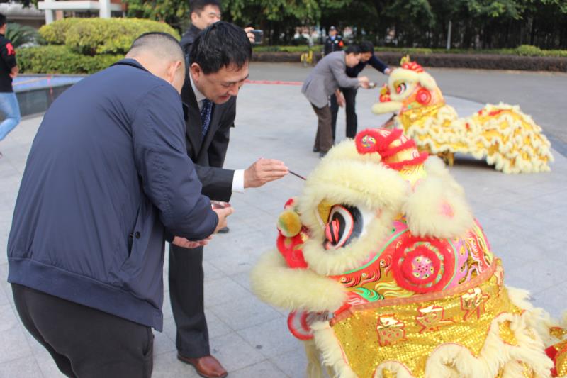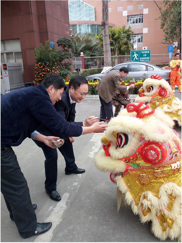 本网讯 “昨夕犬年欢歌迎大地,今朝猪岁新景满神州”。2月2日上午,我校南北校区大红灯笼高高挂,挂出吉祥;欢歌笑语阵阵飘,飘出喜庆。校党委书记隋广军、校长石佑启、党委副书记李云明、副校长刘海春出席了醒狮贺岁活动,分别在南北校区为醒狮点睛,祝福我校在新的一年大展宏图,共建幸福广外。