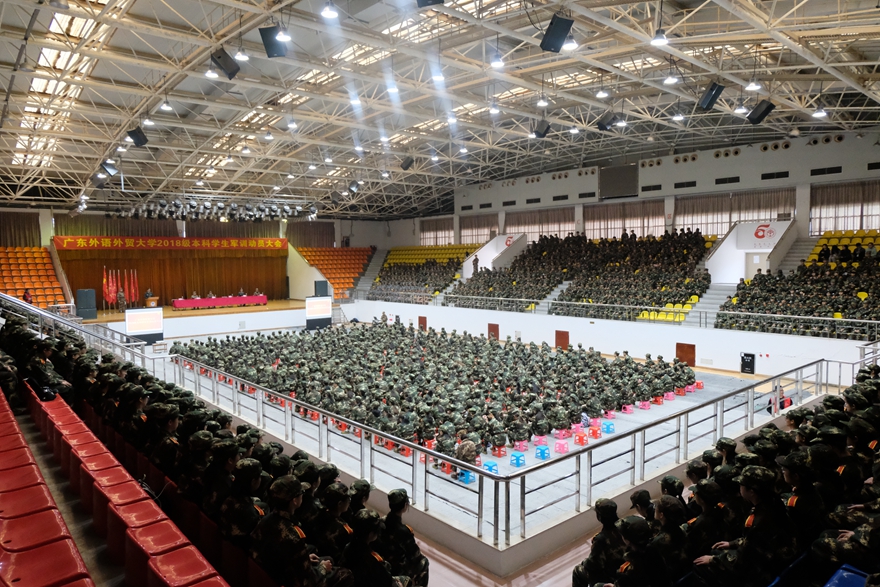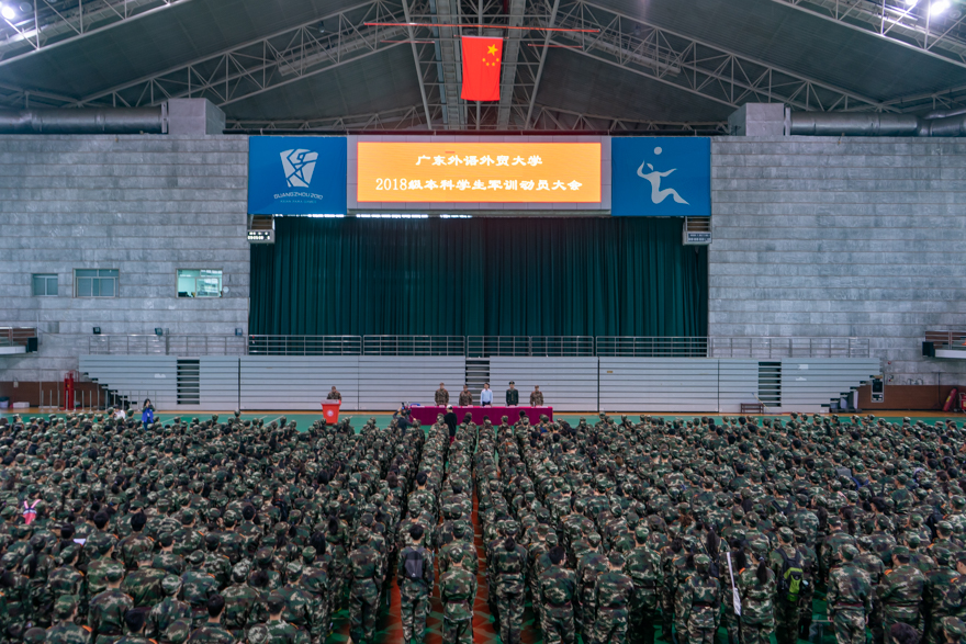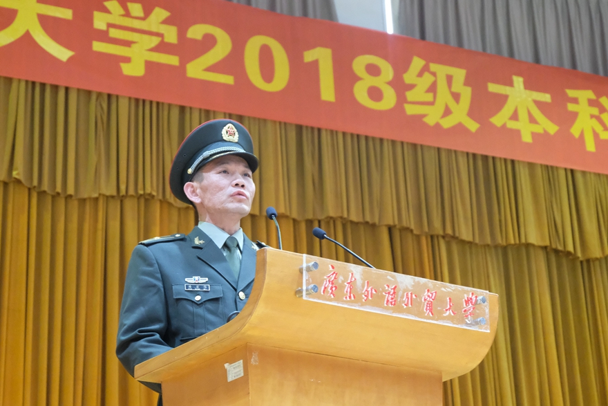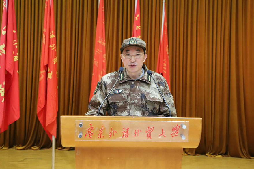 北校学生代表东方语言文化学院学生刘凤仪代表全体参训同学庄严承诺,在军训中尊重教官、服从命令,严格要求自己,为我校增光添彩。南校学生代表法学院学生林杰聪在发言中表示,“通过军训,希望我们能学习军人吃苦耐劳、永不言败的精神,让这种精神在广外学子身上发扬传承。”