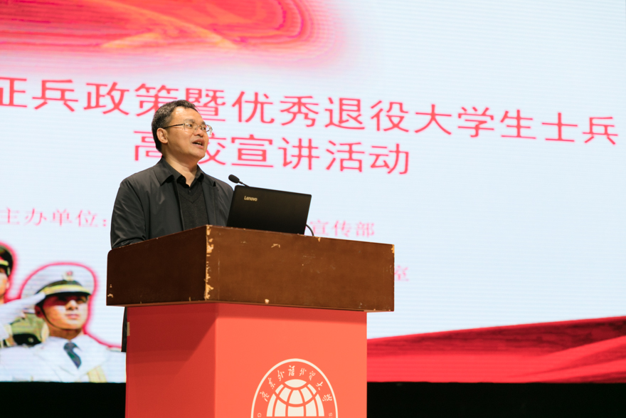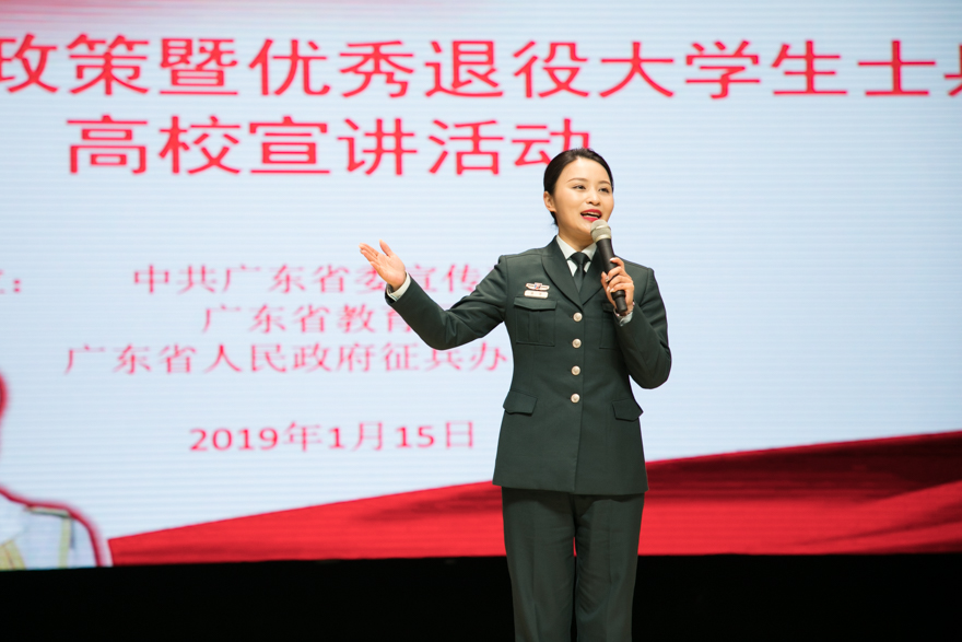 本网讯 1月15日,为积极响应党和政府的征兵号召,推进大学生的应征入伍工作,由中共广东省委宣传部、广东省教育厅和广东省人民政府征兵办公室举办的全省征兵政策暨优秀退役大学生士兵高校宣讲活动在我校北校区云山会堂召开。我校副校长刘建达,广东省军区动员局正营职参谋盛夏,广州市白云区武装部政委叶飞及优秀退役大学生代表出席活动。