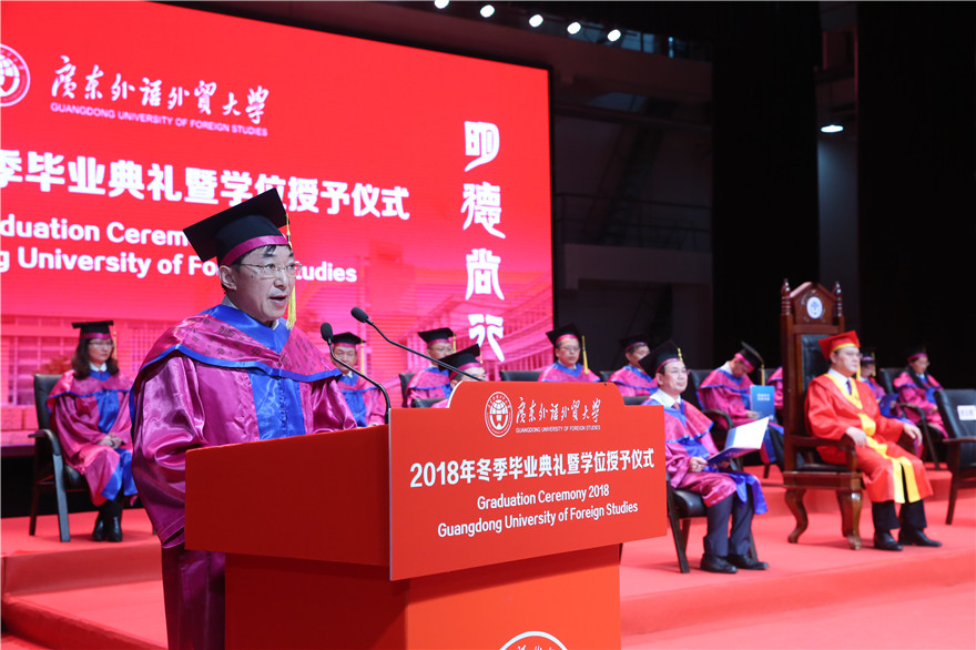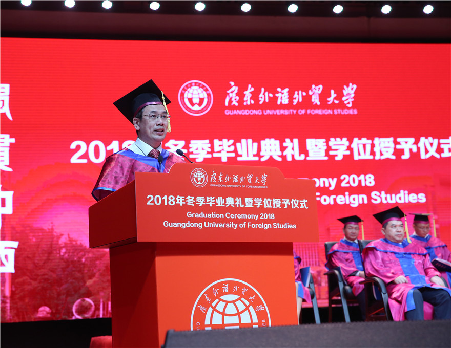 石佑启在致辞中对毕业生以及家人致以最热烈的祝贺和最诚挚的祝福。他寄语毕业生在未来的人生道路上,也能如同在大海中航行的巨轮一般,以厚德修身打牢精神的船体,以开拓创新扬起实践的风帆,以奉献家国把稳人生的航线,朝着人生新旅程新梦想奋勇向前、扬帆起航。一是要在厚德修身的涵养中宁静致远。他讲述了桂诗春先生的事迹,希望毕业生们把“明德尚行、学贯中西”的校训精神和“卓越、诚信、包容、自信”的广外价值观融进自己的血液,在纷繁复杂的社会中始终保持一颗赤诚的初心,修身慎行,宁静致远。二是要在开拓创新的坚持中务实笃行。如今走过四十年伟大历程的中国,将推进新一轮更深层次改革和更高水平开放。石佑启讲述了一个将曾经名不见经传的小厂做大做强,打造成为国内覆铜板行业的龙头企业的我校1970级日语专业校友刘述峰的故事,希望毕业生勇于开拓、推陈出新,将务实、创新的改革开放精神内化于心、外化于行。三是要在奉献家国的担当中找寻方向。他以荣获“全国模范检察官”称号的张宇筠校友为例,希望毕业生在奋勇向前的人生路途上,能够不断充实自己的专业知识和才干,以个人理想助力国家梦想,用家国情怀托举时代使命,在奉献家国的事业中升华奋斗意义、诠释人生价值。