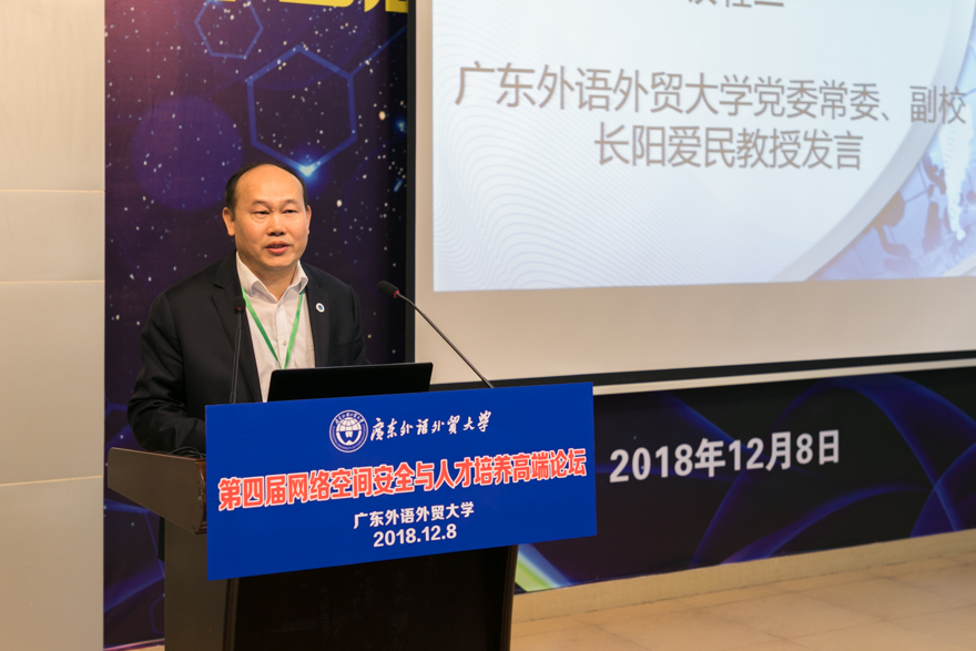 我校副校长阳爱民在致辞中简要介绍了广外的办学特色、办学优势以及广外网络空间安全学院在网络空间安全学科建设和人才培养上所作的努力和取得的进步。广东省信息安全测评中心主任王晓健和上海交通大学网络空间安全学院院长李建华代表网络空间安全教指委发言。