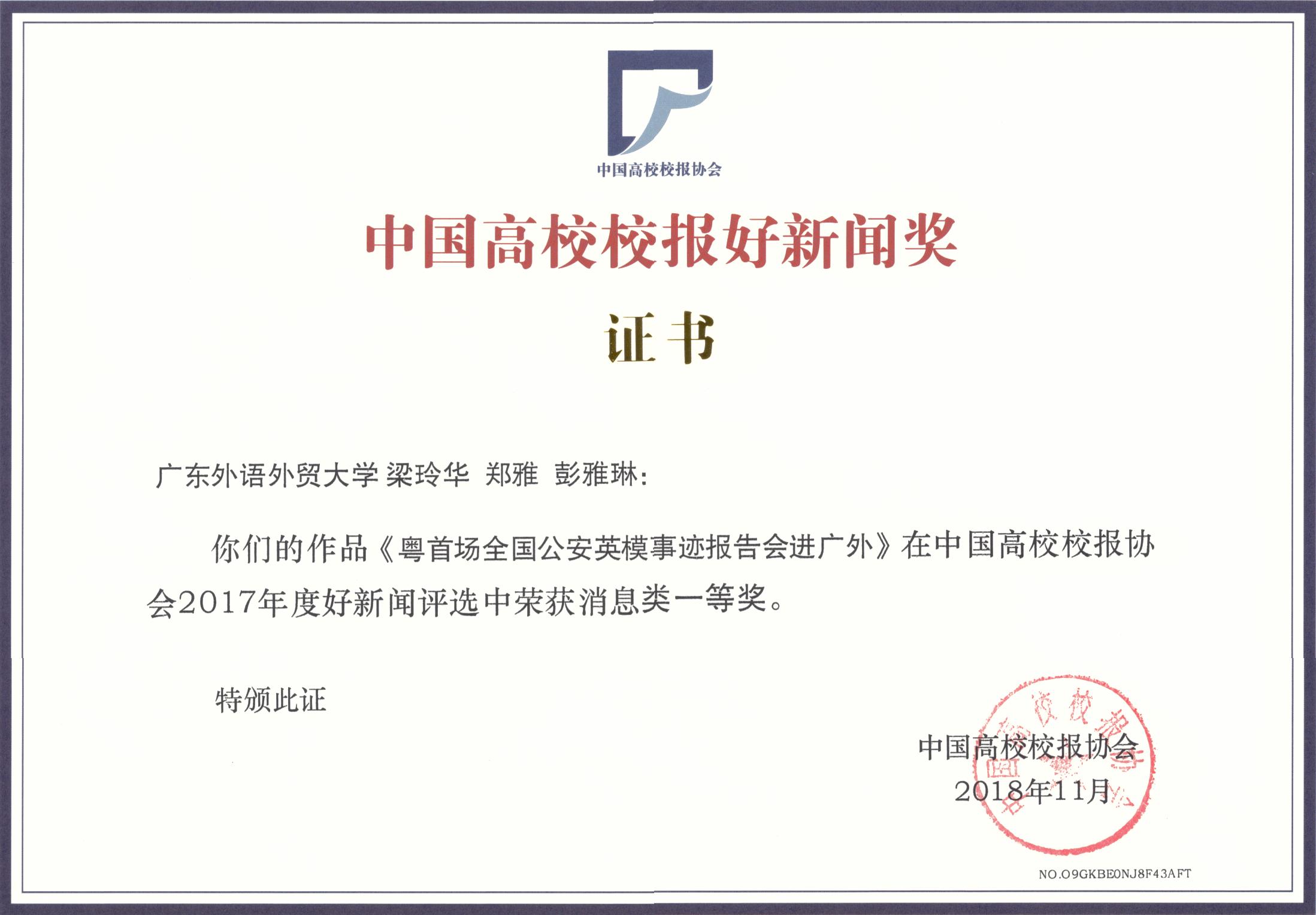 我校获奖的情况是:周喆、张锦成撰写的《“摩族猎人”: 守护“共享城市”的神秘游侠》获版面类一等奖;梁玲华、郑雅、彭雅琳采写的《粤首场全国公安英模事迹报告会进广外》获消息类一等奖;曹晨昱拍摄的《收获的喜悦·与父母见证》获摄影类二等奖;胡文涛、宾锐光采写的《弘扬广外价值观 提振学校精气神》获言论类三等奖;张洁莹采写的《郭桂杭:“把做一名好老师当作生命的一部分”》获通讯类三等奖;刘红艳的《我的广外,52岁生日快乐!》获新媒体类三等奖。