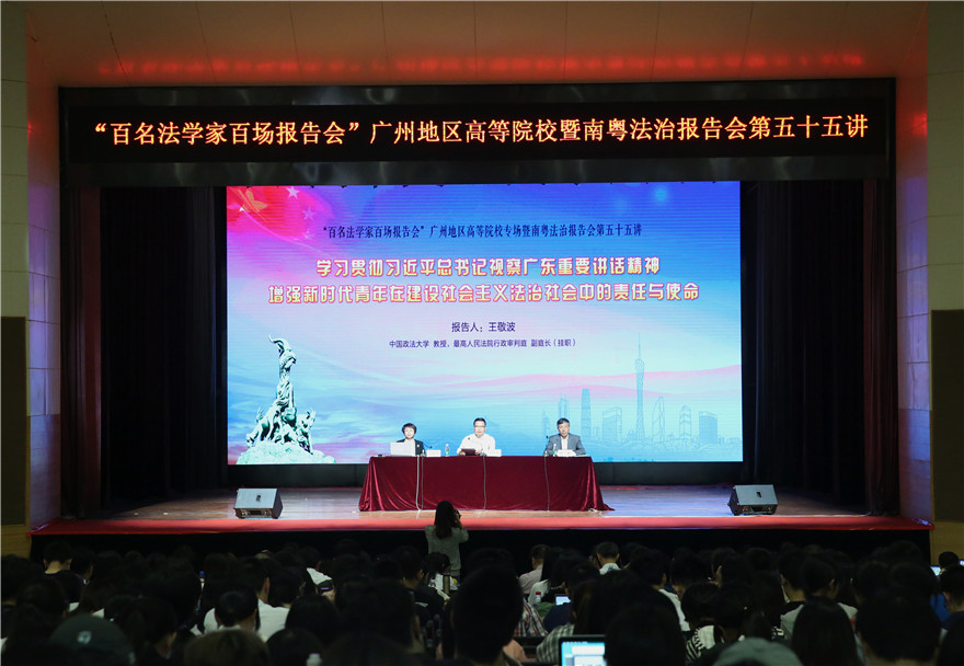 本网讯 11月1日下午,为传达学习贯彻习近平总书记视察广东重要讲话精神,“百名法学家百场报告会”暨南粤法治报告会第五十五讲在我校南校区B8学术报告厅举行。报告会由报告团团长、广东省“双百”活动组委会副主任、省法学会会长梁伟发主持,广东省委教育工委委员、教育厅党组成员、巡视员赵康出席本次报告会,中国政法大学法治政府研究院院长、二级教授、最高人民法院行政审判庭副庭长王敬波作题为《新时代青年在建设社会主义法治社会中的责任与使命》的报告。省教育厅有关处室负责人,广州大学城高校分管领导,相关高校职能部门负责人以及教师和学生共500余人参加了此次报告会。