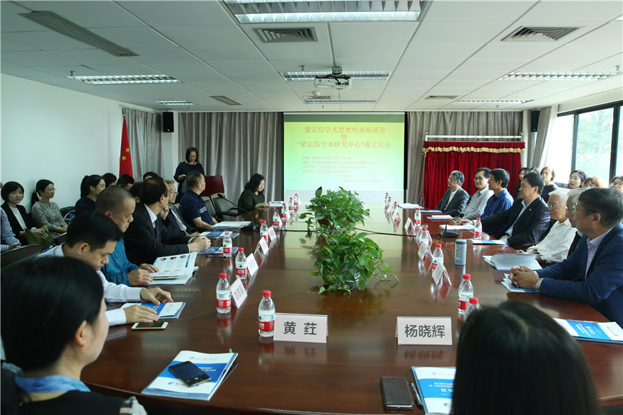 本网讯 11月6日上午,梁宗岱先生逝世35周年之际,我校在北校区图书馆会议室召开梁宗岱学术思想传承座谈会暨梁宗岱学术研究中心成立大会。我校党委书记隋广军、我校原校长黄建华为梁宗岱学术研究中心揭牌。北京外国语大学原党委书记杨学义,天津外国语大学原校长修刚,中国社会科学院外文所所长陈众议,中国法国文学研究会原会长吴岳添,浙江大学世界文学与比较文学研究所所长吴笛,《法国研究》杂志主编罗国祥,中国法语教学研究会副会长刘成富,以及广外原党委书记校长徐真华,广外外国文学文化研究中心原主任栾栋,广外云山讲座教授黄荭等校内专家学者参加了座谈会。