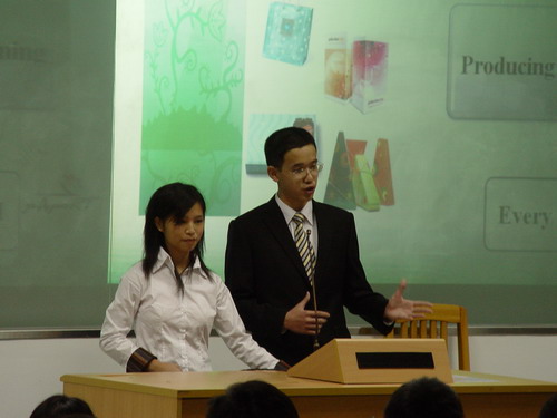 在众多队伍中,有个别队伍凭借独特的创意和新颖的展示成为当晚亮点。第66号队伍就以其别具一格的展示带动起了全场的气氛。而第17号队伍则以键盘刷、USB灯等有新意的电脑相关产品引起了全场同学甚至评委老师的兴趣。选手们流利的口语、自如大方的表现,也为其队伍增分不少。