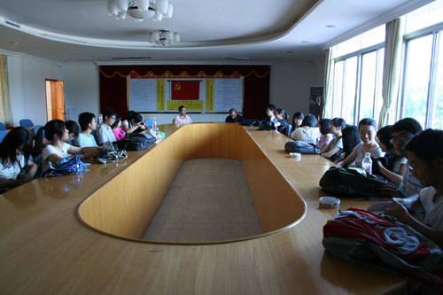 随后,卢炽明、徐光政与队员一行在校接待室进行了短暂的交流。卢炽明向队员们介绍了蔡朝焜纪念中学的基本情况。蔡朝焜纪念中学是由郁南县人民政府主办、旅加华侨蔡秉龙先生捐资1860万元协办的重点完全中学,为纪念郁南籍抗日英烈蔡朝焜而命名。卢炽明同时也表示,由于学校处于欠发达地区,英语教育水平比较薄弱。希望广外学子能利用自身的外语优势,提高这里英语学习的氛围。
