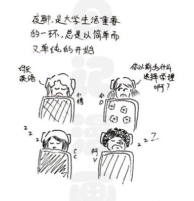 大学里的“卧谈会”是每个宿舍的私密小日记,卧谈话题往往天南海北,大家都无拘无束地发表自己的见解。英文学院的小鱼告诉记者:“很多时候大家聊得太起劲以至于忘记了时间,第二天早上每个人都带着熊猫眼醒来。记得有一次卧谈,不知不觉中已到深夜,我们聊到太high,所有人都不由自主地放声大笑起来。结果我们遭到了投诉,宿管阿姨还亲自登门。大家都挺不好意思的。”