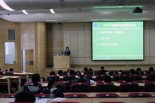 此后,图书馆馆长李敬平向与会人员作图书馆07年的工作报告,其中包括图书馆年度业务工作、重要活动和08年的工作计划。她指出,通过图书馆人员与广大师生的共同努力,图书馆的文献资源建设、读者服务、数字网络化建设和组织活动都有突破性的发展。其中,图书馆开展的“图书馆周”、“捐赠图书”等文化公益活动,得到了师生的热烈支持与响应。她表示,图书馆在与师生的互动中更明确地了解师生的文献信息需求,从而进一步提高了图书馆的服务水平。
