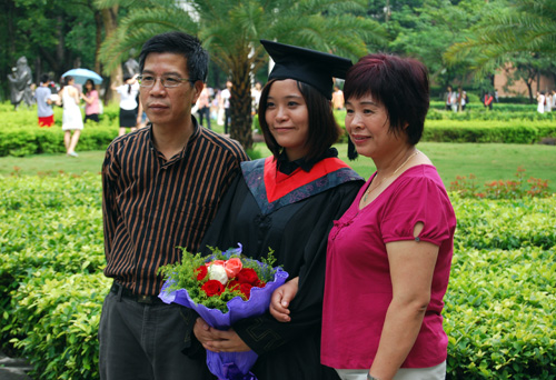 在文化广场的校徽雕塑旁,张女士默默注视着正与自己丈夫合影的女儿,心中感慨万千。从英文学院毕业的女儿即将到香港攻读研究生,她虽感不舍,但更多的是一份安慰。因为她记得,大三的时候,女儿已确定了自己要读研这一目标。身为老师的她本想助女儿一臂之力,却遭到了女儿的拒绝。“妈妈,我可以的。”就因这句话,她开始意识到,也许她可以放开手中的那条牵引着女儿的线了。看着女儿不停地在网上搜集资料,然后亲自把一份份申请寄出,到最终拿到理想的offer,她知道,对女儿可以放心了。