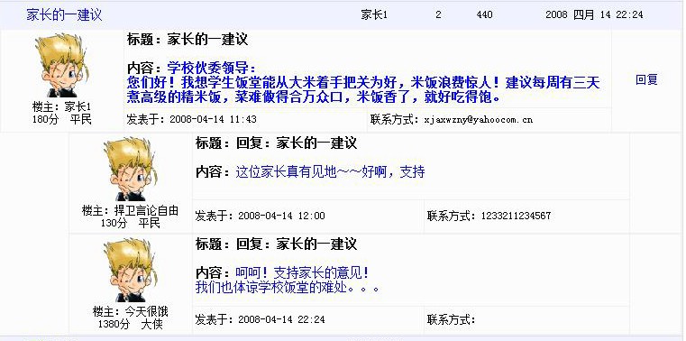 登录我校主页不知从何时开始变成了徐女士的习惯。浏览我校新闻,让她更能解自己女儿生活学习的地方。她还注册了帐号,在学校新闻网中对学校制定的政策和开展的活动留言,献言献策。她曾经在一篇关于饭堂改革的报道中留言道:“希望学校饭堂能从把关米饭质量入手,建议每周有三天煮高级的精米饭,菜难做得合万众口,米饭香了,就吃得饱吃得好。”字里行间,流露出一位家长对孩子备至关怀。