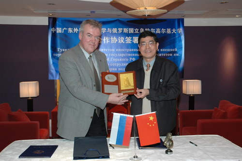 25日上午,我校仲伟合副校长先期会见了俄罗斯乌拉尔大学校长一行,并就广东外语外贸大学与乌拉尔大学建立俄罗斯乌拉尔大学孔子学院项目商谈确定协议书,商议第一届理事会理事、孔子学院院长人选及会议时间。出席会谈的还有俄罗斯驻广