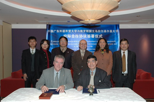 徐真华首先对乌拉尔大学校长此次来访我校表示热烈欢迎,并表示在中俄关系得到发展的大环境下,我校非常荣幸能够与位于叶卡捷琳堡市(该市为广州市友好城市)的俄罗斯乌拉尔大学展开校际合作。乌拉尔大学校长维塔里耶维奇也对徐真华以及中国朋友的热情接待表示感谢。双方在热烈友好的氛围中签署了两校合作协议,旨在推动合作办学、学生互换、教师互换等项目,并预祝两校友谊长存。