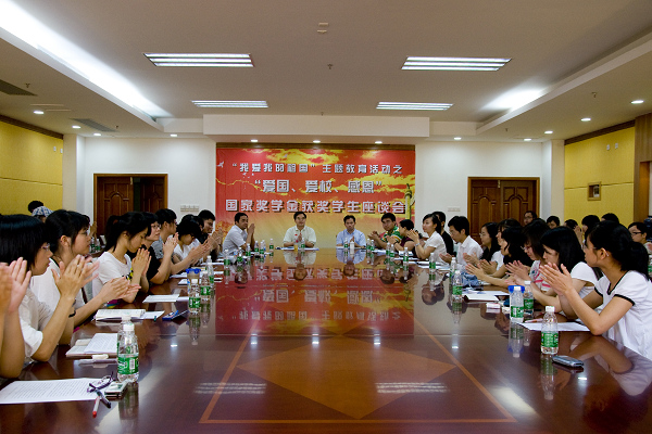 本网讯 6月18日,“我爱我的祖国”主题教育活动之“爱国、爱校、感恩”国家奖学金获奖学生座谈会在南校区第一会议室召开。与会人员包括学生处处长植秀聪、副处长杨敏生,思政科科长陈红霞,英文学院副书记何伟儒,各学院辅导员代表,2008年度国家奖学金获得者及国家励志奖学金获得者代表。座谈会由学生处思政科教师毕建永主持,会上,获奖者代表就“爱国、爱校、感恩”这一主题畅所欲言,植秀聪做了总结讲话。