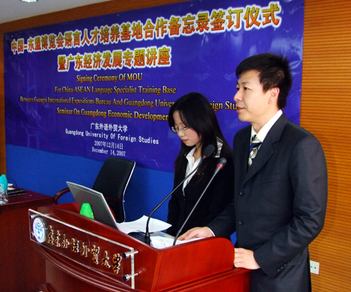 出席签字仪式的有中国—东盟博览会秘书处副秘书长王雷以及秘书处对外联络部部长梁和林,北京东方正龙数字技术有限公司副总经理黄建邦,我校副校长仲伟合以及有关部处、学院的领导等。本次活动由翻译学院党总支书记梁学宏主持。翻译学院的研究生和东语学院的学生担任了翻译工作。