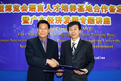 王雷致辞 王雷提议东盟官员进一步密切与中方的工作联系,通过会展合作、电子商务合作等多种形式,拓宽双方合作的渠道,围绕重点领域,深化合作内容,共同做好中国与东盟日常贸易投资促进工作,并充分利用好中国—东盟博览会平台,进一步提高双方经贸合作水平。 致辞过后,双方代表进行签约。王雷代表中国—东盟博览会,仲伟合代表广外,双方在中国—东盟博览会语言人才培养基地合作协议上签字。