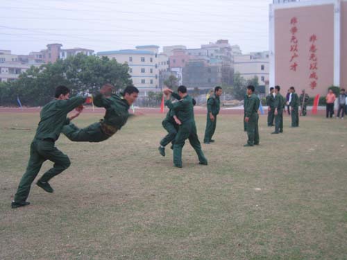 颁奖仪式后,校卫队员们进行军事技能汇报表演。队员们整齐如一的步伐、干净利落的动作引来了同学们的阵阵喝彩声。在模拟一名女同学被抢的情景中,一名校卫队员与假扮劫匪的队员展开对打,经过艰苦搏斗后,凶残的“劫匪”最终被校卫队员擒获。许多同学惊叹队员们过硬的军事素质,为他们高超的“武艺”所折服。