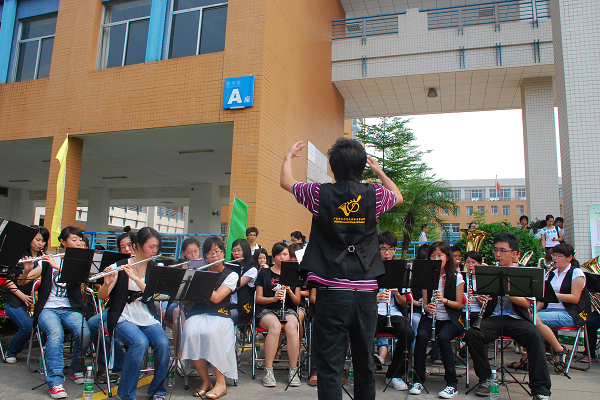 本网讯 6月21日上午8点30分,《长江之歌》在南校区教学楼A座大厅前奏响。校管乐团的演奏拉开了我校第十届大学开放日的帷幕。天气异常炎热,却挡不住考生与家长的热情。
