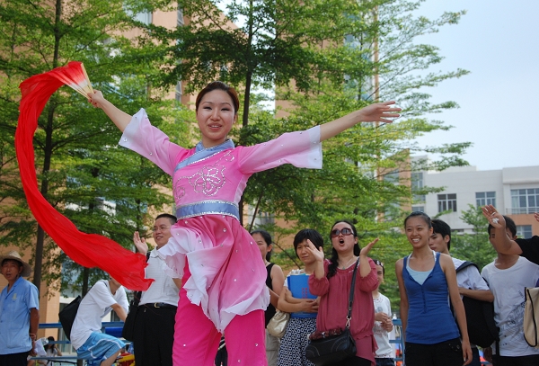 教学区的绿荫下,几位艺术学院的学生正全神贯注地进行素描。留学生也跃跃欲试,充当起了模特。器乐和舞蹈表演一向是艺术学院的特色。激情四溢的演奏,动人心弦的献唱,再配上灵动优美的舞蹈,吸引了不少考生及家长驻足欣赏。西方的曲风萦绕古典的舞姿,原创的韵律撞击即兴的诠释。活动负责人介绍道,这是为了体现我校中西结合的特点。