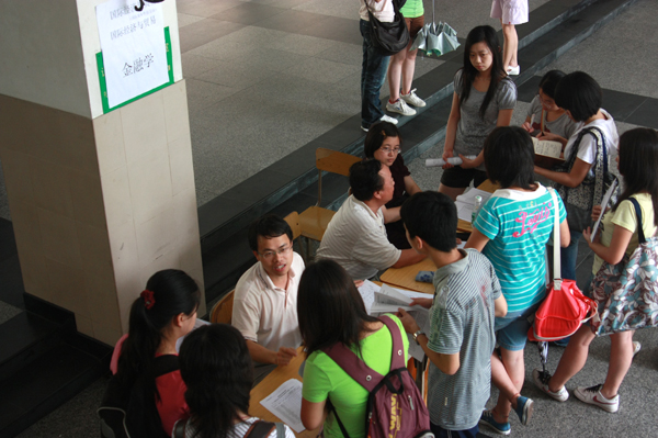本网讯 6月12日下午,由教务处组织的本科“4+0” 双学位/双专业招生咨询会在北校区第二教学楼大厅举行。在咨询会现场,国际经济贸易学院、国际工商管理学院、财经学院、中文学院、法学院、信息科学技术学院、政治与公共管理学院、高级翻译学院和新闻与传播学院九个“4+0”专业开办学院的专业教师与教务处的工作人员一起为同学们了开展咨询活动。