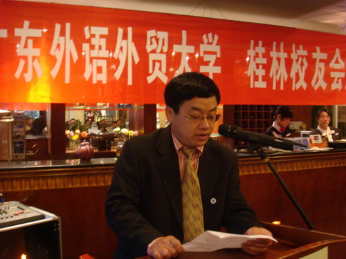 本网讯 12月16日,我校第21个地方校友会——广东语外贸大学广西桂林校友会成立大会在桂林市观光酒店隆重举行。校党委副书记许国彬一行与近50名在桂校友欢聚一堂,共贺广西桂林校友会成立。成立大会由84级德语系校友苏宏云主持。