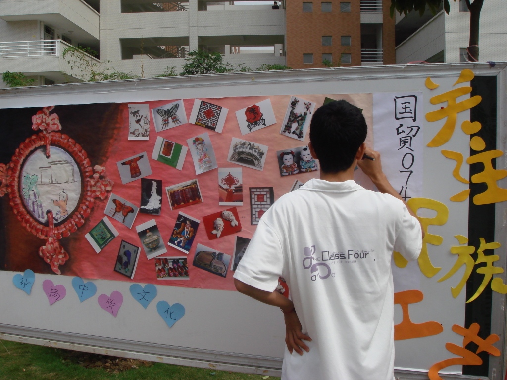 国贸074的同学们紧紧结合了十七大中关于加强对中国传统文化的重视的内容,开展了题为“回首千年文化 关注民族工艺”的团日活动。他们在校道上摆摊设点,教授同学们编制中国的传统饰品,并配以饰品展示和图片展览,吸引了众多同学驻足观看。而且,有很多同学在他们的帮助下亲手编制了精美的中国结。该活动掀起了同学们学习中国传统文化的热情,并得到大家的好评。