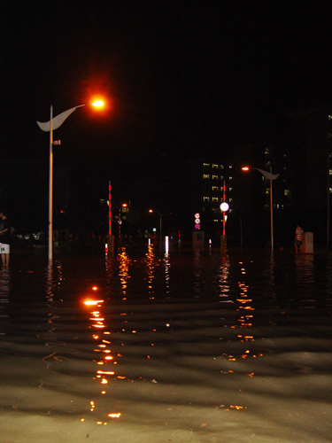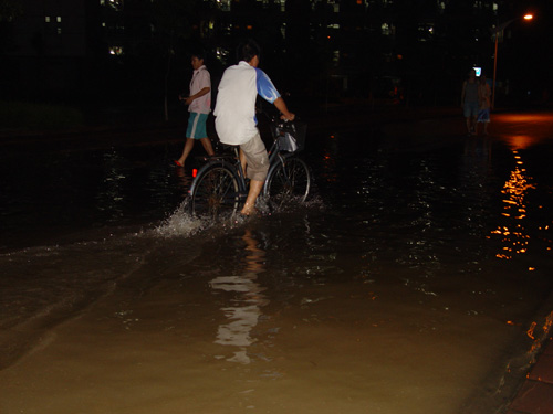 “发大水啦……”、“水浸街啦……”,许多同学走出宿舍,在走廊上“惊呼”,不少人还用相机拍下了当时的情况。学生活动中心旁的十字路口已成泽国,水浸蔓延到八栋宿舍楼前,水深及膝盖,路人行走困难。