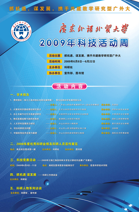 本网讯 广东外语外贸大学“科技活动周”自2009年6月8日正式启动,活动由科研处主办,宣传部及图书馆协办,国际经济贸易学院、国际工商管理学院、西语学院、中文学院、信息科学技术学院和法学院承办了活动周部分活动。活动期间,将在南北校区对2008年度优秀科研业绩及人员事迹进行展览,邀请专家学者举办系列讲座,并召集相关科研人员进行科研工作恳谈会等。活动将一直持续到6月22日。