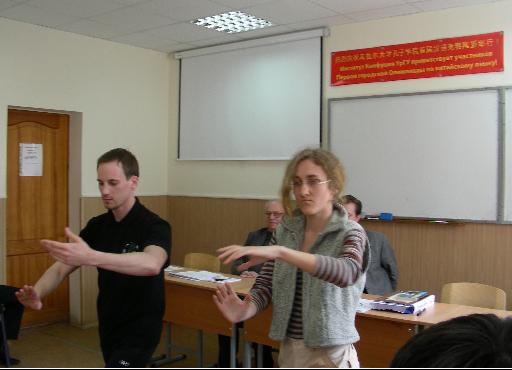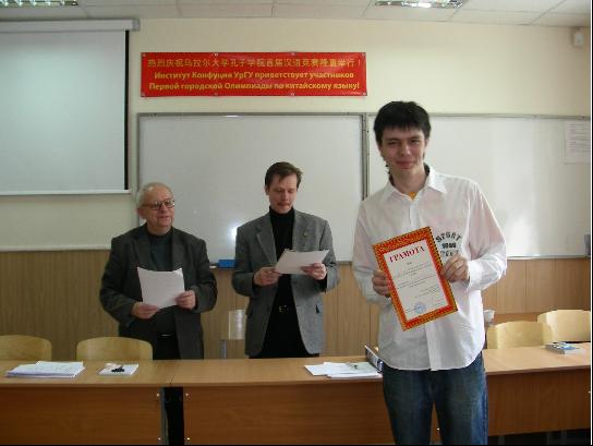 在汉语知识竞赛中,选手们分别进行了汉语综合知识测试(笔试)、汉字书写和中文演讲三个项目的比拼。主办方根据参赛选手的综合得分,评出初级组、中级组和高级组一、二、三等奖各一名及优秀奖若干名。由库兹明教授和斯米尔诺夫院长为获奖选手颁奖。颁奖前,参赛选手伊利亚和娜斯佳为大家表演二十四式太极拳。