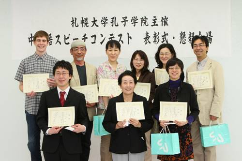 本网讯 5月24日,我校与日本札幌大学合办的孔子学院在札幌大学成功举办了第一届汉语演讲比赛。共有20名学生参加了演讲比赛,其中16名是孔子学院学生,4名是札幌大学学生。比赛分初级、中级、高级三个组,每组分别设立一等奖、二等奖、三等奖各一名。参加比赛的学生最大的70岁、最小的18岁。约有60余位孔子学院学生以及参赛者亲属前来为参赛者加油。
