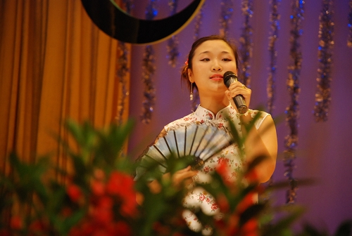 身穿淡雅旗袍的广外选手温情演唱《月亮代表我的心》