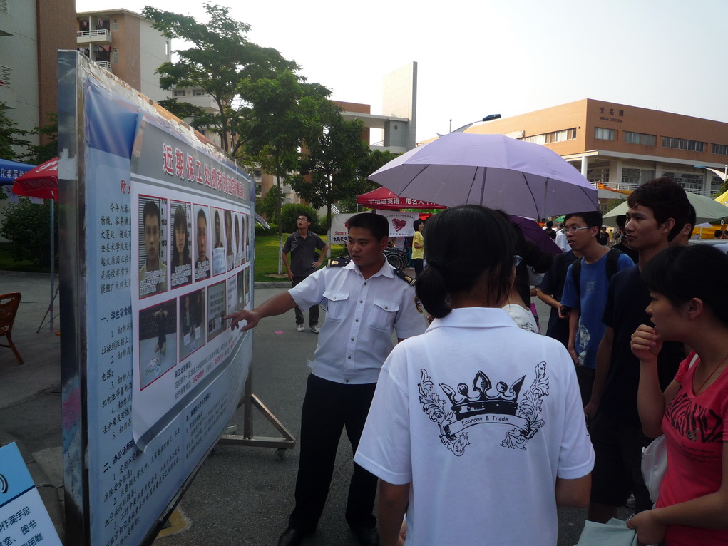本次活动分别于5月14日下午、5月21日下午在南北校区举行,现场摆放了十几块形象生动的宣传展板,分别展示了我校近期抓获的犯罪嫌疑人照片及案情和安全保卫的相关知识,包括“预防犯罪基本常识”、“小心手机信息诈骗”、 “预防犯罪基本常识”等。针对我校女生多的特点,保卫处制作了“女士防贼要点”、“女士斗贼十招”等展板,吸收了众多女生的目光;针对学生宿舍盗窃案屡有发生的特点,制作了“学生宿舍防盗温馨提示”、“公寓安全警示语”等展板,并特地邀请驻校民警为同学们解答防盗知识;针对校园多发盗窃自行车、手提电脑等案件,制作了犯罪嫌疑人照片及案情简介,并安排专业人员为广大师生现场讲解。同时,保卫处印制了6000余份宣传单,在现场及各学生宿舍楼进行发放。