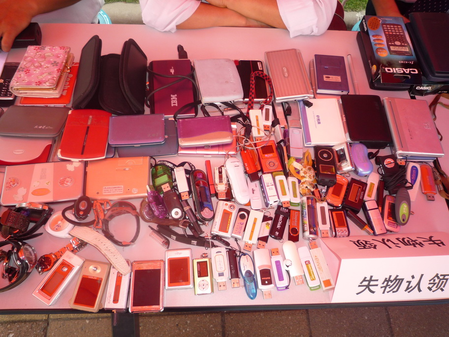 失物招领处摆放着大量学生遗失物品,包括自行车、手机、MP3、移动硬盘、电子辞典、身份证、银行卡、借书证、一卡通等,吸引了许多同学来查找认领。政管学院的李同学发现了自己前几天刚刚丢失的自行车,工作人员认真核实情况后,当场将自行车发还给他,他再三向保卫处表示感谢。