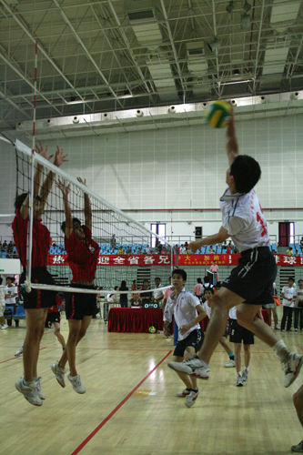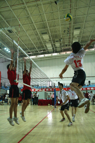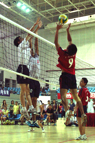 本网讯 5月22日下午,2009年广东省大学生男子排球联赛决赛在中山大学大学城校区体育馆打响,首度闯入甲组决赛的广外男排迎来了卫冕冠军广工男排的挑战。由于技术及经验均稍逊一筹,广外最终以0:3不敌对手,三局比分为17:25、17:25、26:28。而在早上决赛的女子甲组五、六名争夺赛中,广外女排3:1击败广东金融学院,取得第五名。