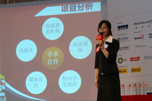 围绕为贫困地区少年儿童捐书的项目主题,4支队伍在经过大约半个月的项目策划执行后,于当天分别上台进行项目陈述,并在评委提问环节斗智斗勇,展示个人风采与团队凝聚力。经过激烈角逐,由中大的童泳欢、张俊青,我校的郑向溢、暨大的彭珈和华农的吴炜组成的第二小组以出色的表现摘得最佳团队奖,他们募集的有效书本占募集总数的66%。此外,第四小组来自中大的选手范典凭借最多新浪网友支持,荣获最佳人气奖。安利公司人力资源总监表示将为冠亚季军以及最佳人气奖得主提供实习机会。