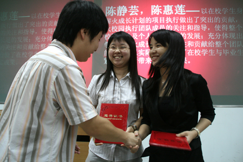 接着,大会为09-10年度的新讲师颁发聘书并为讲师陈荔,黄捷文,陈静芸,陈惠莲颁发了突出贡献奖。08-09年度讲师,前讲师负责人郭旭佳作为讲师代表发表讲话。他说,薪火由最初的概念发展到现在的规模,要归功于学校的支持与鼓励。他希望以后能从学生发展,毕业生发展,学校发展三个层次来发展壮大薪火。薪火创始人苏业勤则提到相信在学校的帮助下,下一年的薪火会办得更出色。