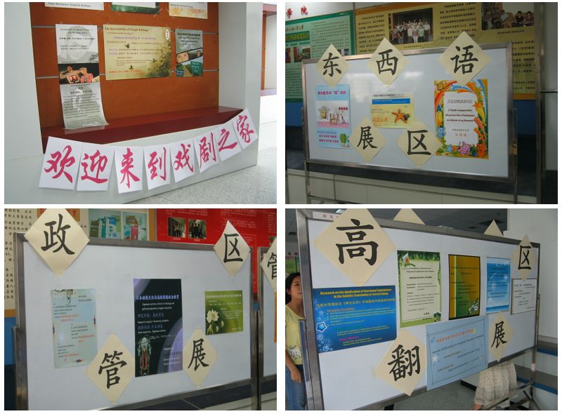 展览按学院划分为英文、中文、经贸、法学等十大展区,选手自制的论文海报显得格外抢眼。其中,英文学院参展选手最多,展区最大,还制作了专门的班级海报。相比之下,中文展区则以其浪漫、儒雅气质取胜,经贸、法学等以关注民生,切合实际见长。