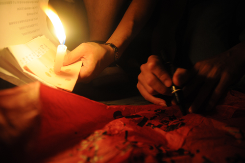 同学们将心愿与祝福写在孔明灯上(记者\苏俊鸿)