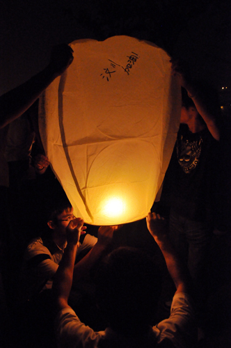 在大学城广大 同学们放飞孔明灯(记者\董晗笑)