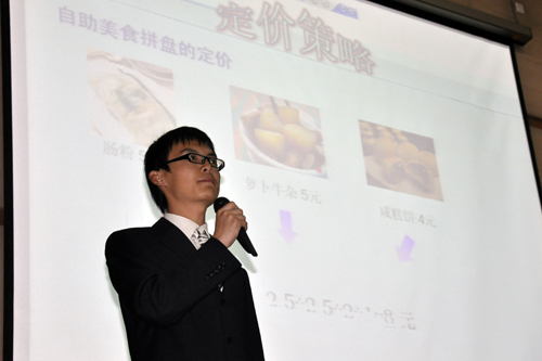本网讯 5月7日晚上7时,由我校国贸协会主办的第三届广外大商业策划大赛在图书馆二楼举行。管理学院老师钟育赣、万万和刘石兰出席并担任评委,统一企业粤西区食品销售公司总经理陈浩文及国贸协会指导老师何元贵也到场观赛。BENKO队策划的韩食专卖小站夺得比赛桂冠,胡建雄、王晓秋、冼健辉、陈巧玲和黄志伟获得统一企业的暑期实习机会。