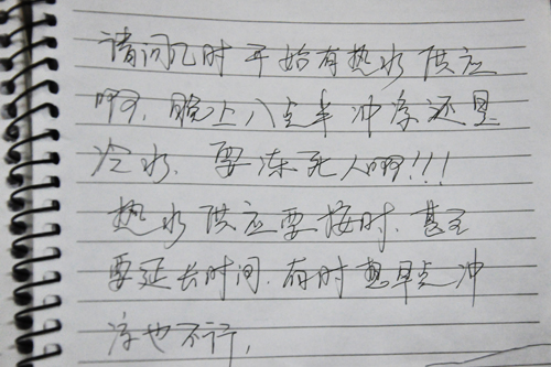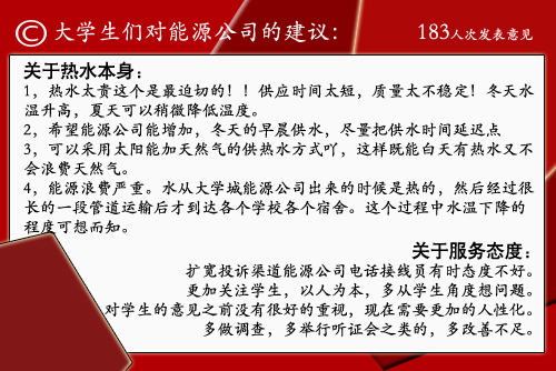 热水问题一直备受学生关注,我校有关部门也常常收到学生投诉。学生宿舍楼下的意见簿上不断出现“请能源公司不要让热水在冬天降温!”、“为何晚上九点多了还没有热水?”、“热水供应时间能不能再延长一点?”、“热水水表出故障,半个月前就报修了,为何还没有处理?”等等字样。然而,负责整个大学城热水供应的能源公司由始至终从未出面解释,问题也仍未解决。