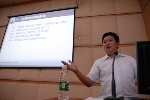 本网讯 4月23日下午,广东省委宣传部外宣办常务副主任莫高义博士应邀来我校新闻学院讲学。副校长方凡泉向莫主任颁发了客座教授聘书。作为一个专家型的领导,莫高义对网媒的特征如数家珍,整个讲座精彩纷呈。